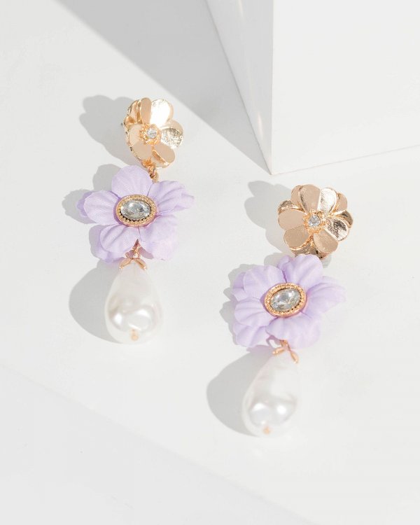 Gold Double Flower And Pearl Drop Earrings